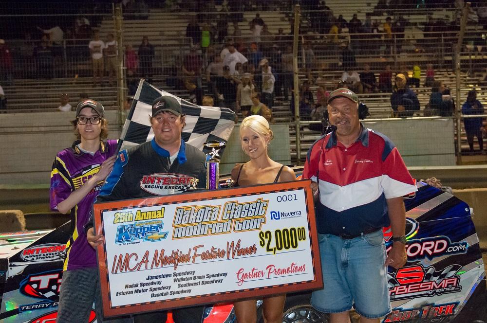 IMCA Modified Champion at the McQuade Distributing ND Gov Cup. Jeff Taylor of Cave City AK. Photo Credit LPT Images Trophys by Capital Trophy, Bismarck ND