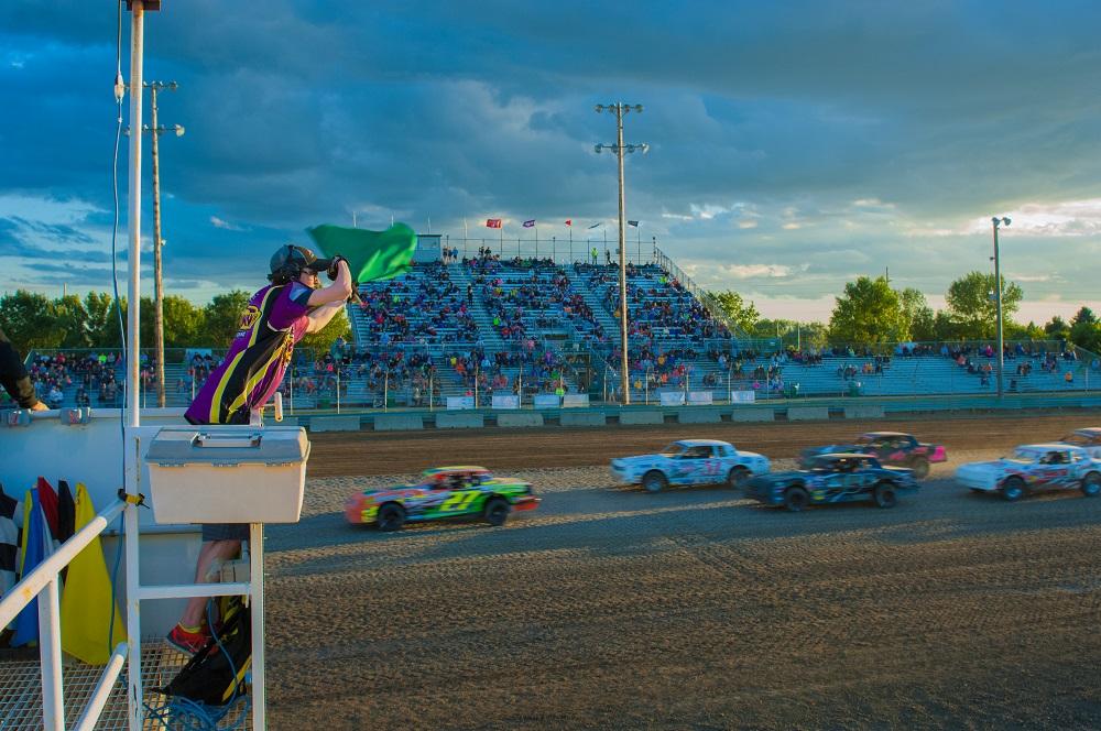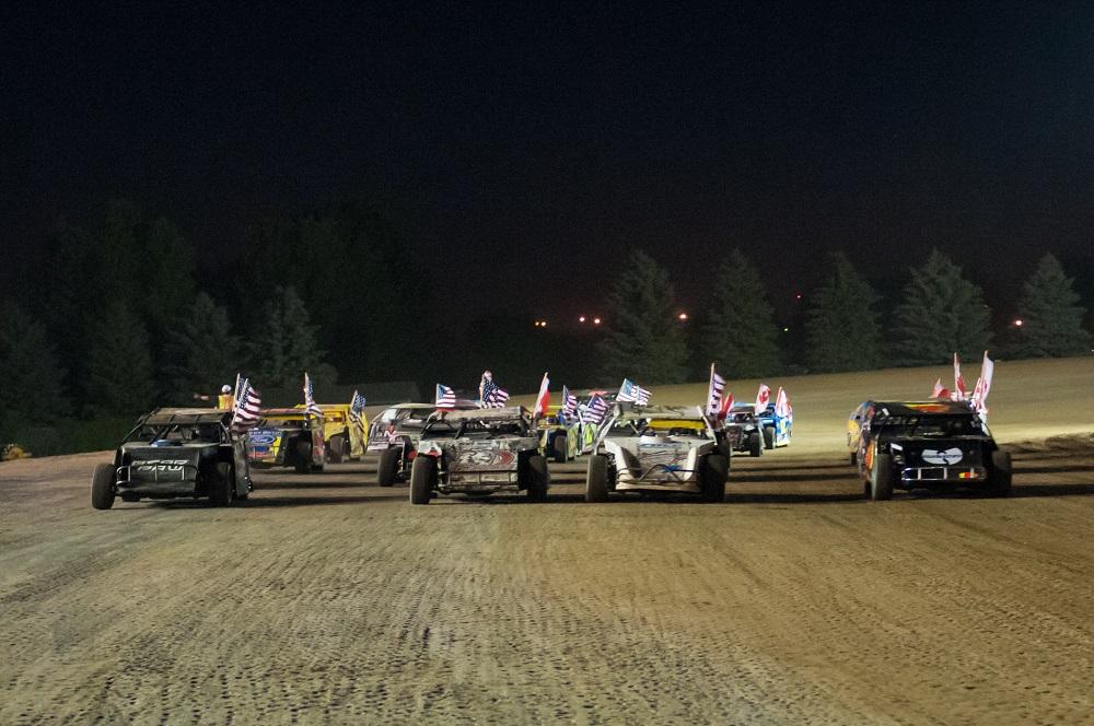 this is a restart of the McQuade Dist. ND Governor's Cup Wissota Street Stocks photo credit LPT Images Flag build by Conder Flags