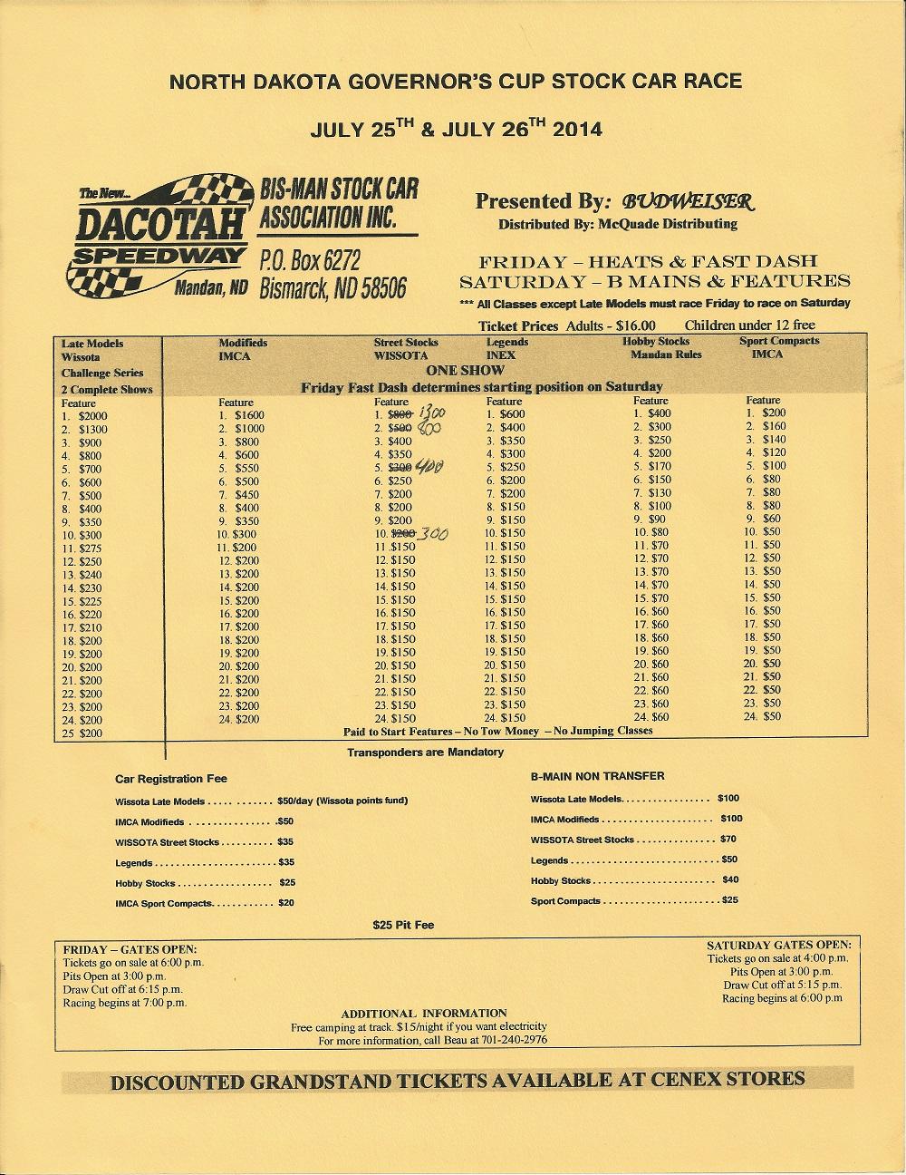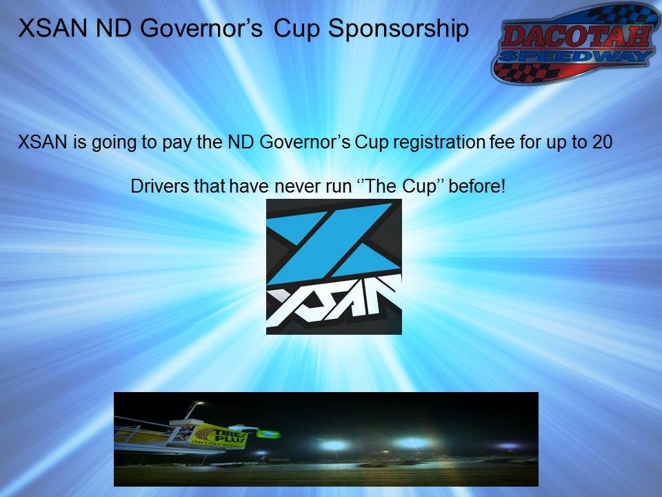 We have a new deal for the McQuade Distributing-Bismarck ND Governor's Cup Races. For drivers that have never ran ''the cup'' before, XSAN will cover the car registration up to 20 cars!! Thanks XSAN and McQuade's for being such awesome partners! To register for this program fill out our competitor form located at this link http://www.dacotahspeedway.net/CompetitorPofileVersion3.pdf you will have to print this off fill it out then email or snail mail it to info@dacotahspeedway.net or to the mailing address on our website please put at the bottom first time ND GOV CUP