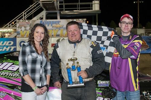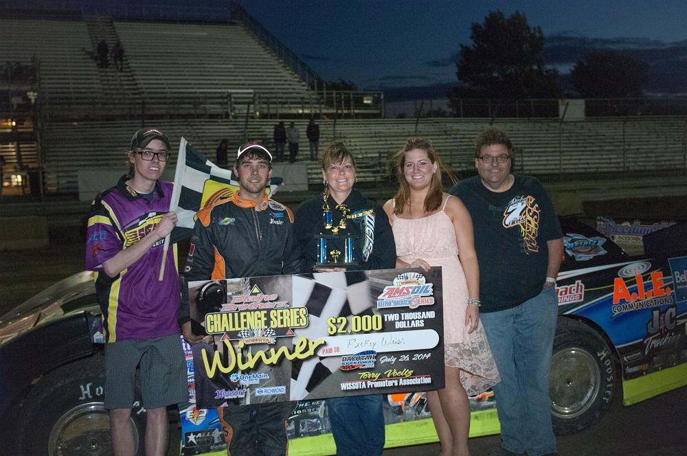 Scott Gartner's first Wissota Street Stock feature win! Scott is part of Wissota's Crate motor test program. Racing is a true family event as the family is pictured in victory lane. Photo courtesy of LPT Images