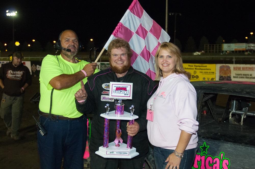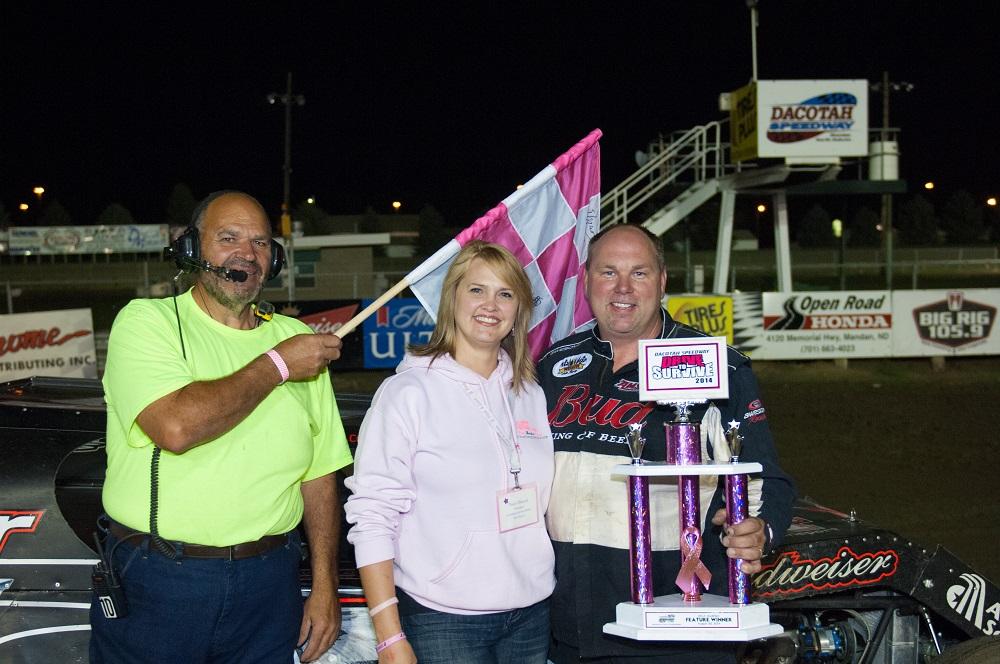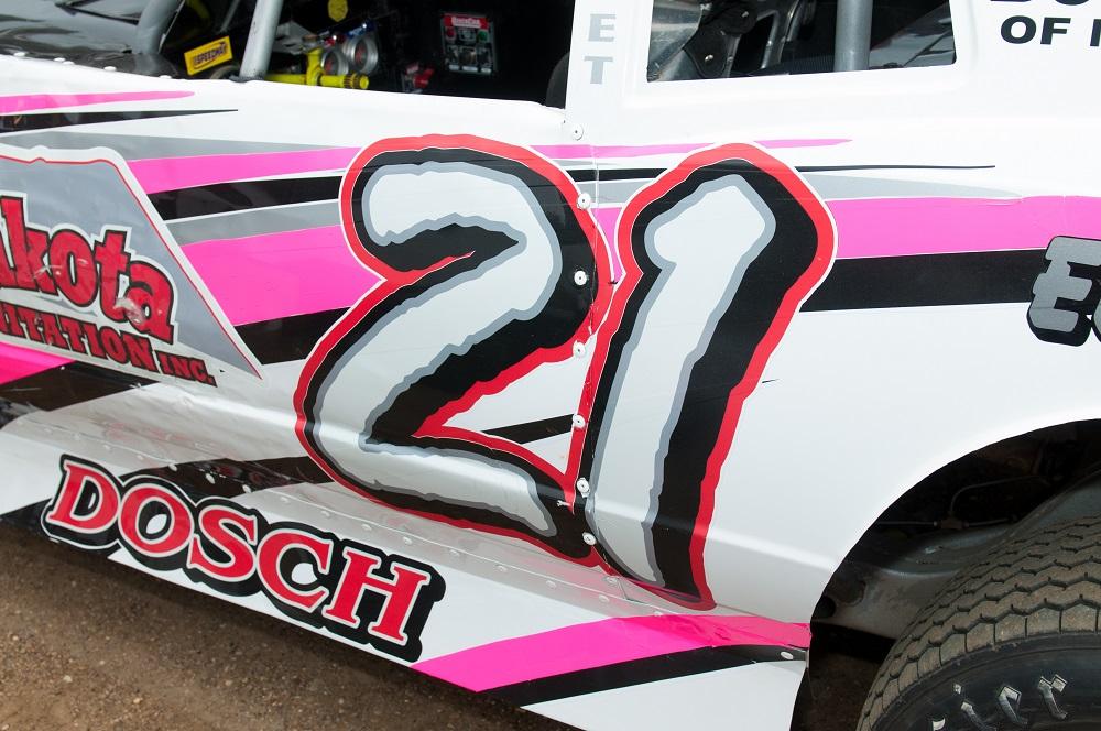 IMCA Modified Driver Brian Swenson's car turns pink for our 6th annual Drive To Survive race. At intermission the door panel and rear fender was auctioned off to raise money for the Bismarck Cancer Center Foundation! Photo Credit LPT Images