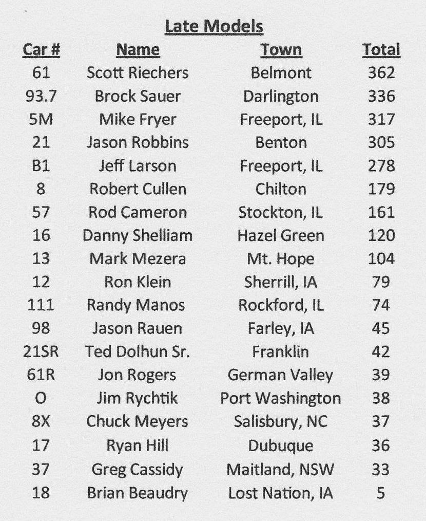 Late Model Standings as of July 23, 2011 at The Lafayette County Speedway in Darlington, Wisconsin