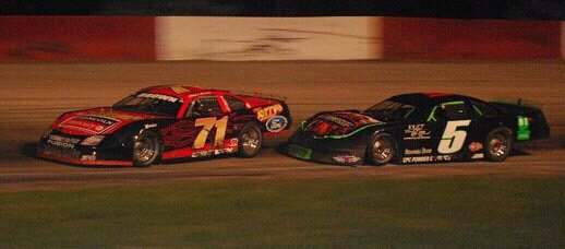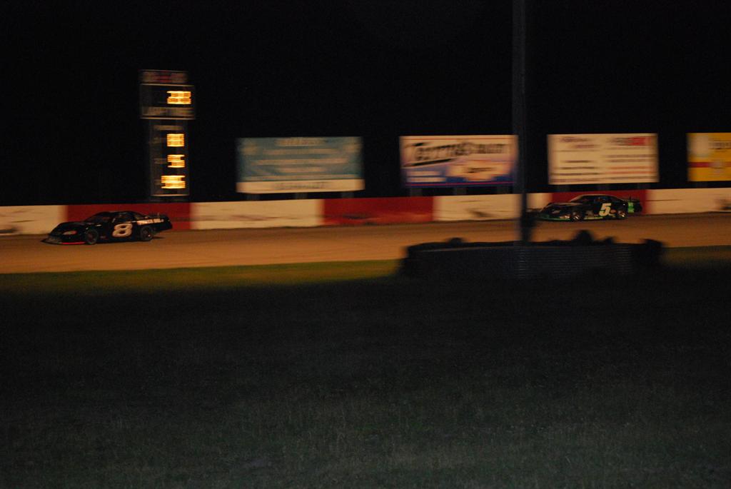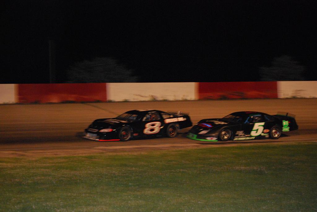 Brett Sontag(#5) trying to run down Eddie Hoffman(#8) during 30 lap SLM Feature