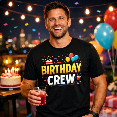 Birthday crew tee designed for rooftop party night fun