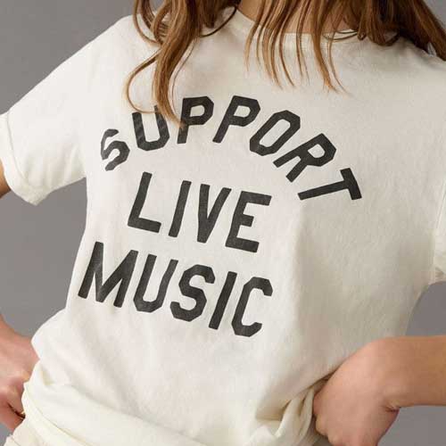 Support live music statement print on cream tee shirt
