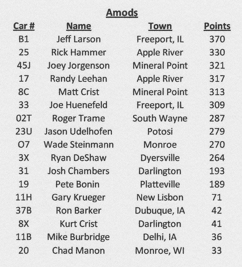 A-Modified Standings as of July 23, 2011 at The Lafayette County Speedway in Darlington, Wisconsin