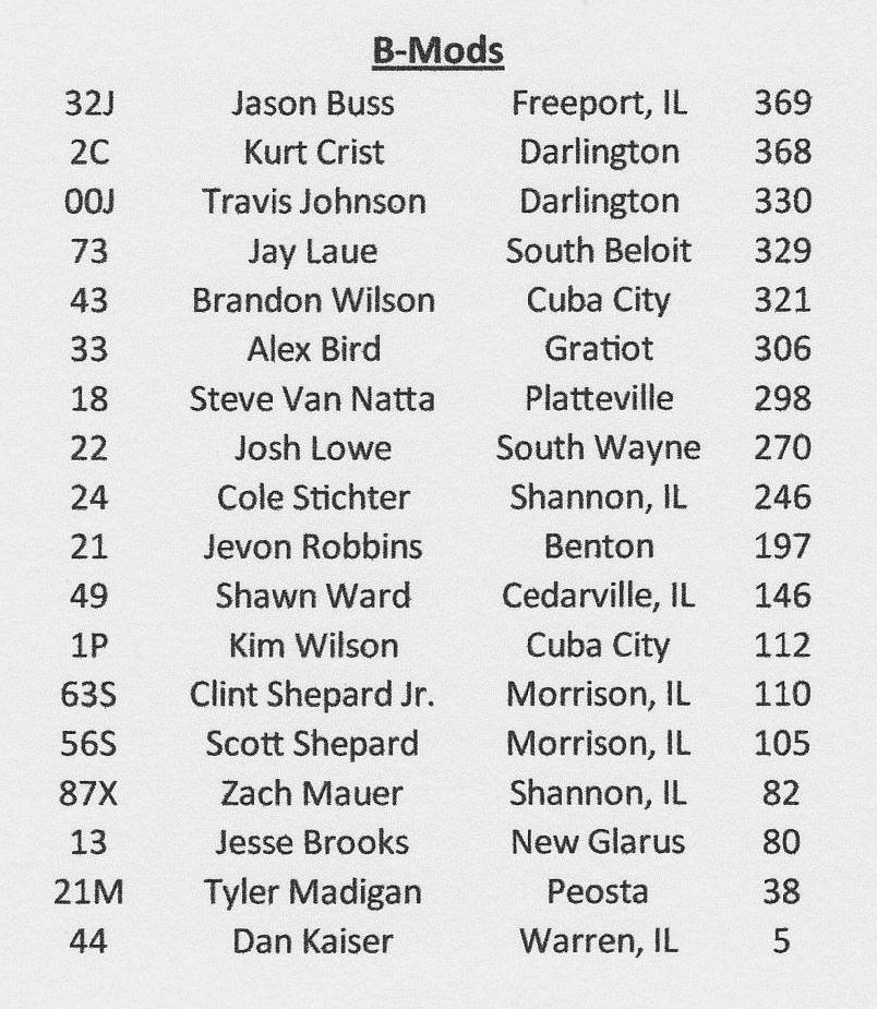 B-Modified Standings as of July 23, 2011 at The Lafayette County Speedway in Darlington, Wisconsin