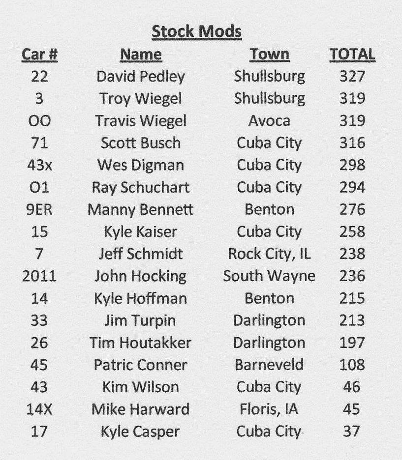 Stock Modified Standings as of July 23, 2011 at The Lafayette County Speedway in Darlington, Wisconsin