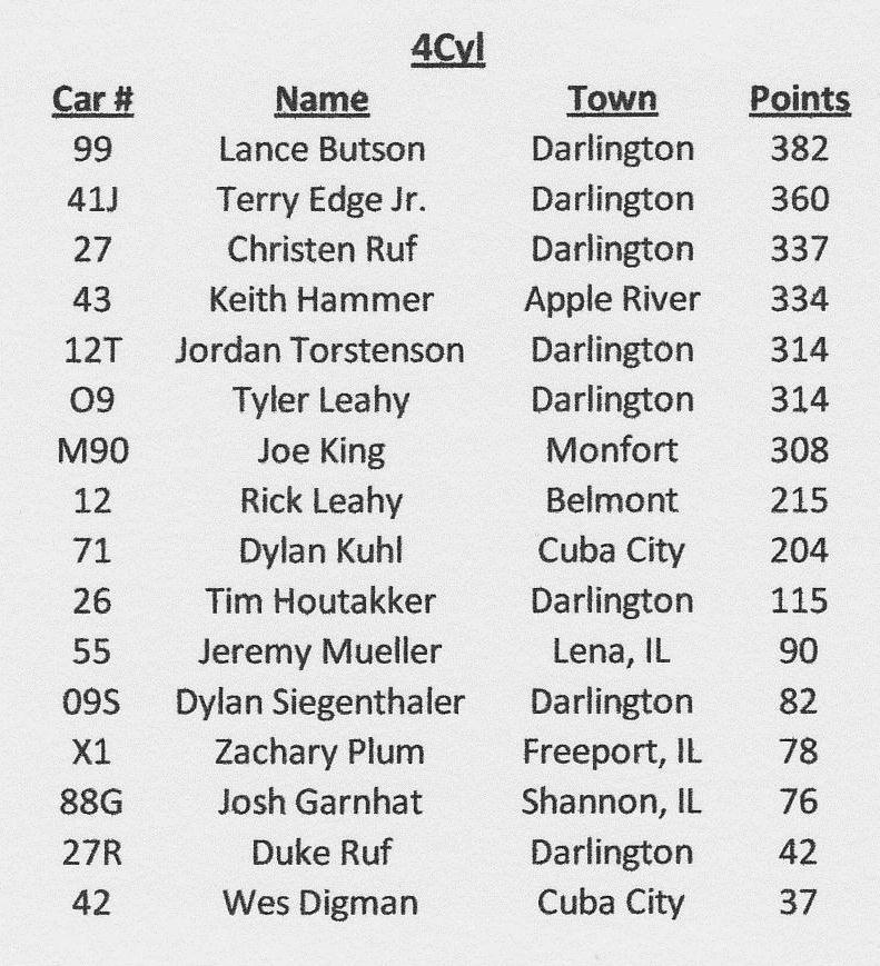 4 Cylinder Standings as of July 23, 2011 at The Lafayette County Speedway in Darlington, Wisconsin