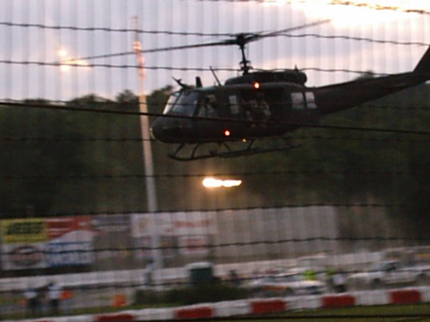 Flying into the Speedbowl in a UH-1 Huey for a National Guard sponsored night at the races